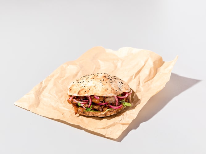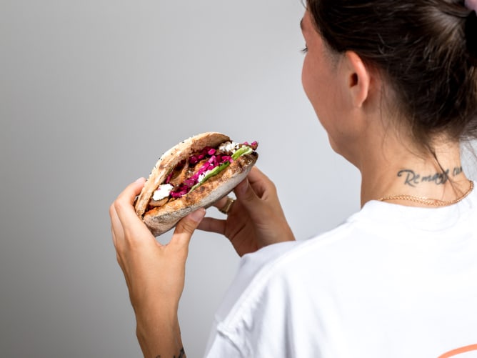 Für die Entwicklung der Saucen und Toppings haben wir Baki von Bakikocht an Bord geholt. Mit seinen türkischen Wurzeln und seiner Kreativität hat er während der Corona-Pandemie eine treue Fangemeinde aufgebaut. Für unseren AGORA MARKET Döner hat er innovative Kreationen mit anatolischem Hintergrund entwickelt, wie etwa Çoban-Salat oder Ezme in Form einer Sauce. Das Fleisch für unseren Döner beziehen wir von der renommierten Metzgerei Jenzer, mit der wir einen speziellen Poulet-Fleischspiess inklusive Marinade entwickelt haben. Für die vegane Alternative sorgt Planted. Das Brot, ein wesentlicher Bestandteil unseres Döners, wurde von Nicolas Schwob, dem Teigspezialisten von «rabbithole Basel», entwickelt. Er studierte Lebensmittelwissenschaften an der ETH Zürich und schrieb seine Masterarbeit über Sauerteig.