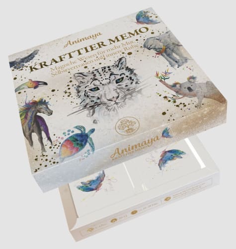 Ich begann, diese besonderen Tiere zu malen und auf verschiedene Produkte zu bringen, damit sie Menschen auch außerhalb meiner Arbeit begleiten können. Daraus entstand die Idee zum Krafttier-Memo – ein Spiel mit meinen handgemalten Tieren, das spielerisch Konzentration, Resilienz und innere Ruhe fördert.