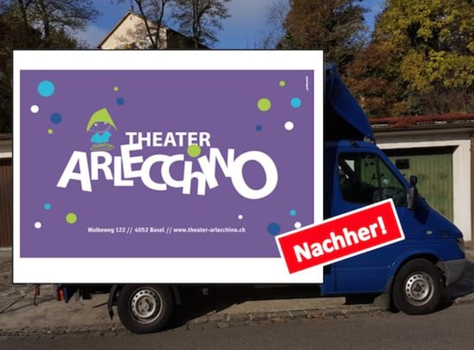 Um unser Theater noch bekannter zu machen und um noch mehr Kinder und Familien anzulocken, hat uns ein guter Freund des Theaters die Seitenwände seines Lieferwagens als Werbefläche zur Verfügung gestellt. Für diese grosszügige Geste gebührt ihm ein herzliches Dankeschön! Auf vier Rädern dürfen also unser Arlecchino-Männchen und der Schriftzug durch die weite Region rollen, um unseren Namen noch bekannter zu machen. Gross und bunt auf den Seitenwänden eines Lieferwagens (siehe Bild ’vorher’ und Bild ’nachher’!).
