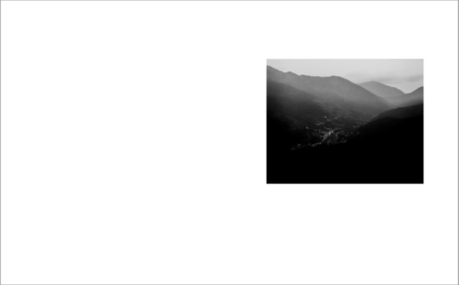 Dans un deuxième temps, pour rendre le projet plus immersif, j’ai utilisé l’écriture pour raconter cette expérience, ce lieu et ses habitants. Le texte se présente comme un récit de voyage qui, au fil des pages, nous confronte aux habitants de ces montagnes. Ce récit vient complémenter le travail photographique, et donne une autre vision d’un même auteur sur un même lieu. Ainsi des jeux se créent entre le récit qui décrit l’expérience, et les images qui sont elles-même le résultat de cette expérience.
