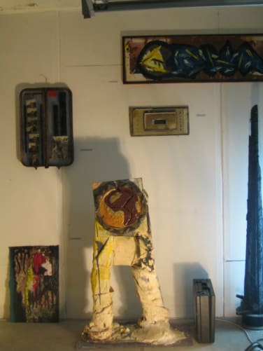 » artgaragen work « April 2014 Assemblage: Öl, Dispersion, Acryl auf Presspappe, Filzabdeckung, Papier, Pappe, Elektroteil