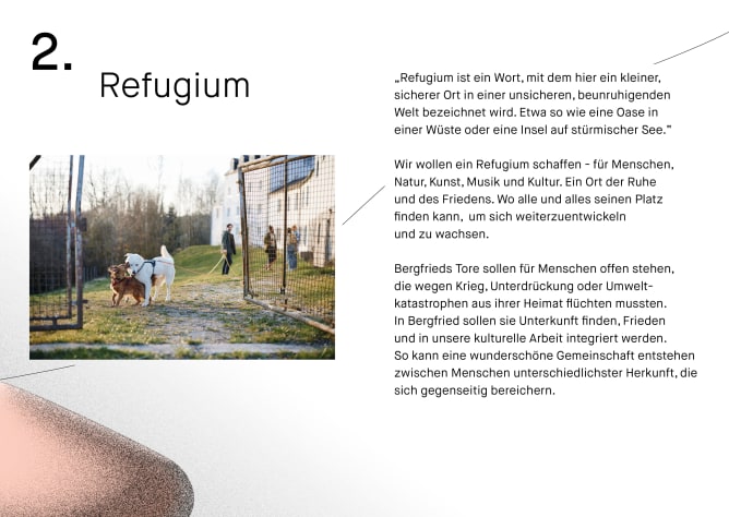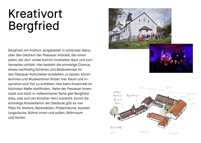 Wir laden KünstlerInnen, MusikerInnen, HandwerkerInnen, PädagogInnen, LandschaftspflegerInnen, NachbarInnen, Groß und Klein zu uns ein. Eine Chance, sich auszutauschen, zu vernetzen, regionale und internationale Einflüsse zu verbinden und frische Ideen an einem ehemals verlassen Ort entstehen zu lassen. Bergfried ist ein Platz zum Denken und Handeln, wo Kreativität in höchstem Maße stattfinden kann. Wir schaffen ein kulturelles Zentrum für die Stadt Passau, für den Landkreis und über die Landesgrenzen hinaus, das ganzjährig von KünstlerInnen betrieben wird.