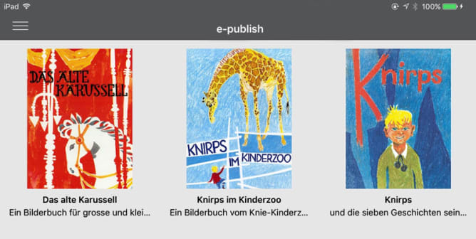 Oeffnet der geneigte Betrachter nun die App erscheinen die drei Bilderbücher. Durch anklicken können die Bilderbücher für Fr. 9.– pro App gekauft werden.