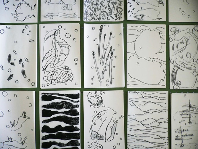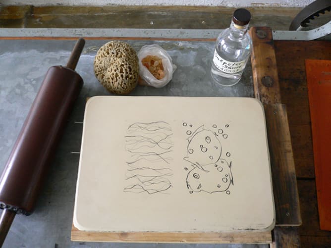 My observations became the source of the book «Boxfish & Co.». I am drawing and printing each of the pages with my lithography press, in an edition of 12 copies. Contrary to the astonishing colours of the sea I am printing with black ink only.