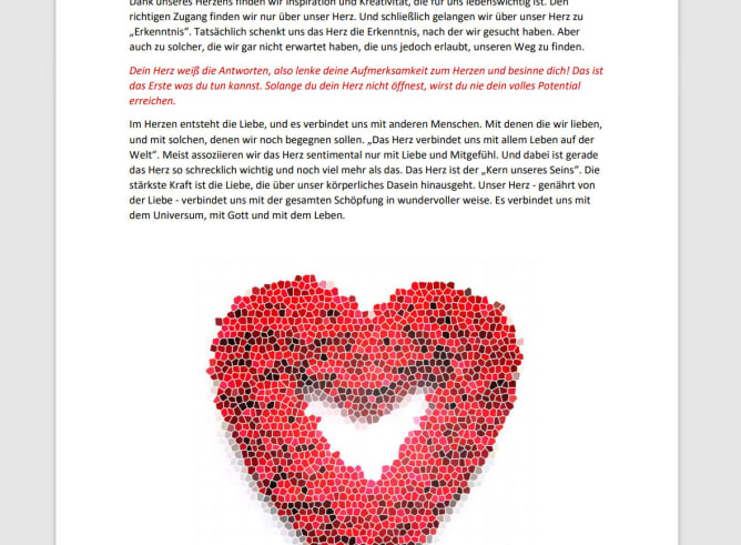 Das Herz steht nicht nur im Zentrum des Menschen, sondern sogar im Zentrum des ganzen Universums. Alles was du fühlst, denkst und machst, wird im Grunde genommen vom Herzen aus gesteuert - bzw. von der Herzfrequenz bestimmt. Wir sollten erkennen, dass es enorm wichtig ist, nicht nur im Einklang mit Kopf und Bauch zu stehen, sondern sich vor allem von der «Weisheit des Herzens» führen zu lassen.