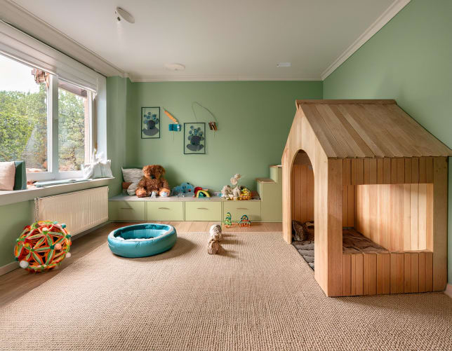 🐾 POUR LES CHIENS : Installation de sols adaptés pour préserver leurs articulations. Mise en place de parois modulables pour délimiter des espaces sécurisés. Achat de mobilier adapté; lits douillets, jouets, gamelles, cabane. Éclairage doux et chaleureux pour créer une ambiance calme et apaisante. Plantes et éléments naturels non toxiques pour ajouter une touche de verdure et de naturel à l’espace.
