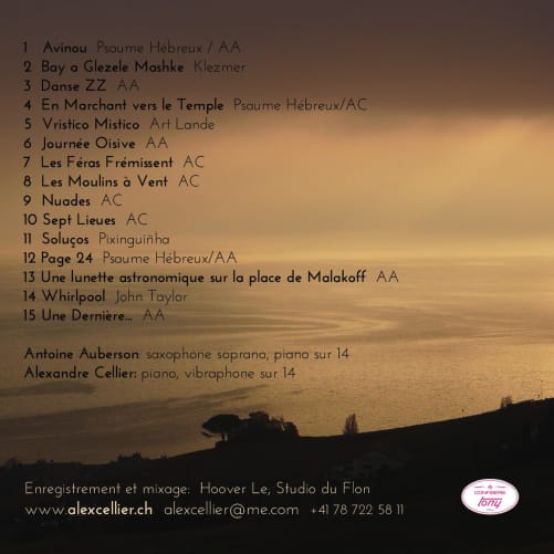 Woaouw! c’est fantastique! en quelques jours vos contributions sont arrivées comme une guirlande d’étincelles qui nous réchauffent le coeur. Et comme on est en train de répéter intensément cela nous nous stimule beaucoup. Il y a par ex. Frank de Paris qui nous a soumis de beaux thèmes sur lequel Antoine a déjà composé, en un jet, une superbe mélodie «Une lunette astronomique sur la place de Malakoff» avec une main gauche qui groove un max. MERCI ! Grâce à vous la vie est encore plus belle! et Merci pour vos commentaires chaleureux. je prends note des réservations pour ceux qui désirent plusieurs places. pour le 26 et 27 à Lutry il y a déjà pas mal de réservations mais il reste bcp places pour le 25 à Cully et on va organiser un repas-concert le 5 mars 2016 au Signal de Grandvaux. Un endroit très sympathique idéal pour la convivialité musicale. Toutes les infos seront sur www.alexcellier.ch Encore MERCI! A bientôt! Les 2 As