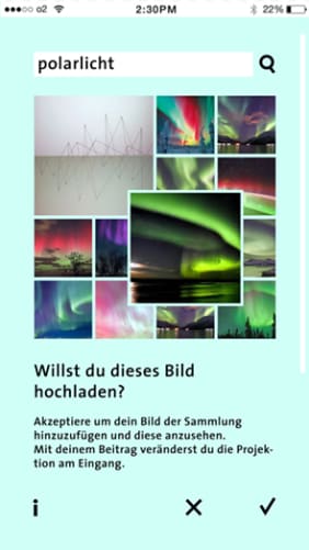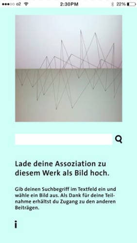 Durch das Scannen eines QR-Codes in der Ausstellung oder Eintippen einer URL gelangst du auf die Webseite dieser Applikation. Dort wirst du aufgefordert, deine Assoziation zu einem bestimmten Werk als Bild hochzuladen. Mit deinem Suchbegriff kannst du Bilder in einer Bilddatenbank suchen und ein passendes auswählen. Diese Bilder werden in einem Archiv gespeichert. Nachdem du etwas hochgeladen hast, bekommst du Zugang zu diesem Archiv und somit auch zu den Assoziationen der anderen Teilnehmer. Diese Bildsammlung dient als Grundlage für die Projektion des kollektiven Werkes.