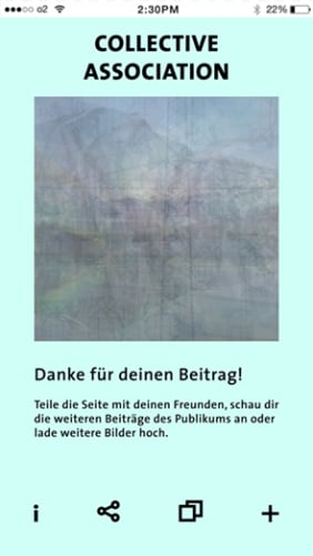 Das kollektive Bild wird in die Ausstellung projiziert. Es besteht aus einer zufällig generierten Auswahl aus dem Archiv der hochgeladenen Bilder und aktualisiert sich nach jedem neuen Beitrag. Du kannst also mit deinem Bild Teil von diesem kollektiven Bild werden.