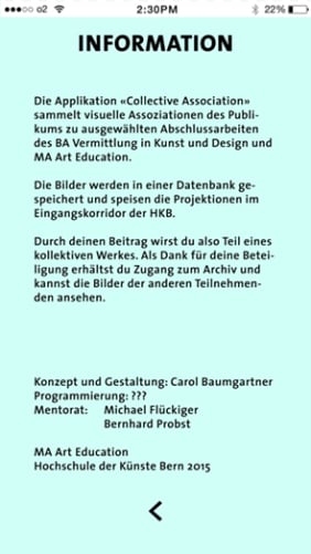 «Collective Association» ist eine interaktive Web-Applikation für Mobile Devices im Ausstellungskontext. Die Anwendung fordert die User auf, ihre Assoziationen zu einem Werk als Bild hochzuladen. Diese werden gesammelt und durch einen Algorithmus zu einem kollektiven Bild zusammengeführt, welches in die Ausstellung zurückprojiziert wird. Als Belohnung für das Mitmachen erhalten die User Zugang zum Archiv aller hochgeladenen Bilder. Die User vermitteln also untereinander, indem sie sich verschiedene Zugänge zu dem Werk anbieten und so die Vielfältigkeit der Rezeption aufzeigen.