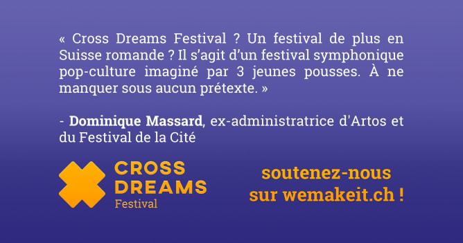 Avec le Cross Dreams Festival, nous voulons mettre en valeur les plus grandes oeuvres de la pop-culture – qu’elles nous viennent du cinéma, du jeu vidéo, des séries tv ou d’ailleurs encore – en réalisant des concerts des plus belles bandes originales avec des orchestres parmi les meilleurs de Suisse romande.