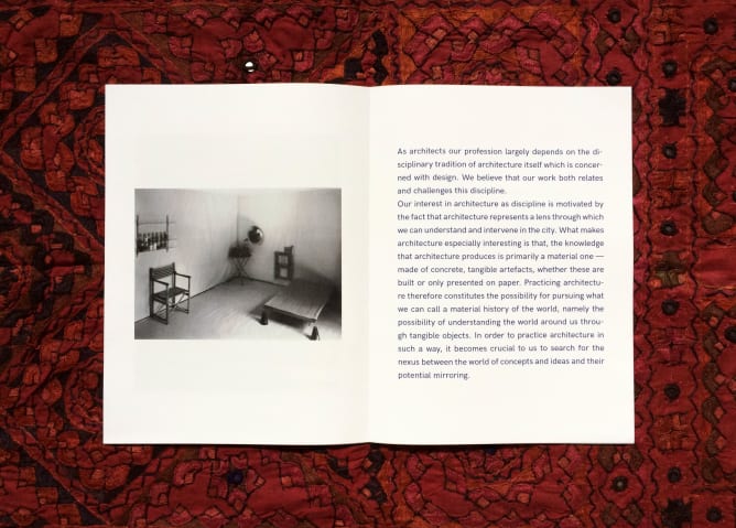 The publication is a collection of interviews with architects, photographers, artists and filmmakers coming from different countries and operating in different domains gravitating around the world of architecture. We asked all architects and artists to give us one image of their choice and a text describing their personal understanding of their profession. While the first one is more the expression of a conscious or unconscious aspiration, the second one is a rational understanding and declaration of intention. The text of the interview which follows is the result of a vis à vis conversation around a topic specifically decided with each figure. It is an unprecedented critical exploration of the domain of their work, their visions and hopes. Finally comes the complementary iconographic section, nevertheless not of minor relevance, that expresses the ideas that shape their thoughts and their visions.