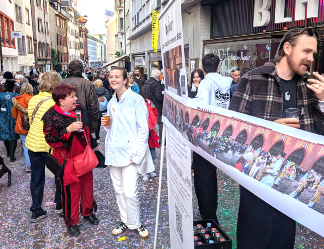 Am Fasnachtsmontag haben wir den Cortège vor dem Rathaus mit vier Kameras eingefangen und in der Nacht auf Dienstag erstellten die Grafiker einen ersten Auszug, sodass wir die ersten paar Meter vor dem Bajour-Fasnachts-Pop-up an der Schneidergasse präsentieren können. Um das ganze Projekt umzusetzen, fehlen noch 2000 Franken - jetzt spenden!