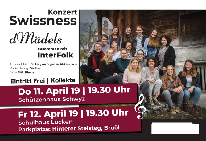 Am 11. und 12. April 2019 geben wir in Schwyz (Schützenhaus Schwyz und Aula Schulhaus Lücken) zwei Konzerte unter dem Thema Swissness. Mit unserem Projekt wollten wir uns einmal ausschliesslich mit Schweizer Künstlerinnen und Künstler befassen und so die CH-Musikwelt besser kennen lernen. Unteranderem singen wir klassische Volkslieder, zum Teil neu arrangiert, aber auch Stücke von Interpreten wie Lo&Leduc, Gotthard und Patent Ochsner. Damit dieses Projekt finanziert werden kann, sind wir auf andere MusikliebhaberInnen angewiesen, die uns unterstützen möchten.