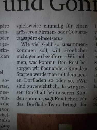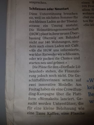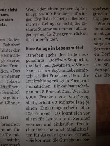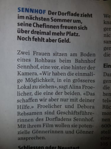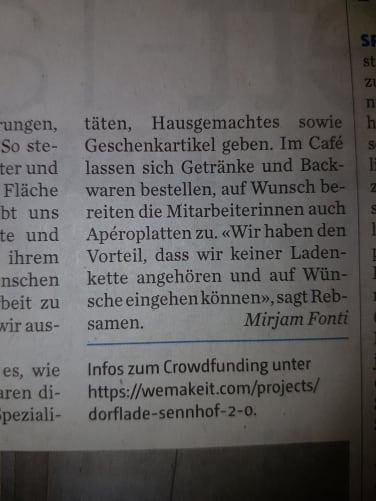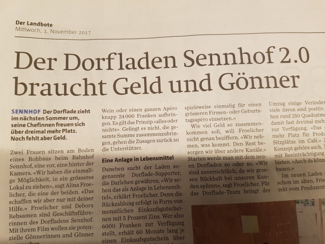Sorry, leider war der Zeitungsartikel nicht lesbar… Nun hier detailliert… :-) Viel Spass beim Lesen! (Leider war der Artikel nicht online, deshalb nur als Foto verfügbar. Bitte entschuldigt die schlechte Bildqualität…) Oder auf unserer Website: https://dorflade-sennhof.ch/landbote-berichtet-vom-crowdfunding/