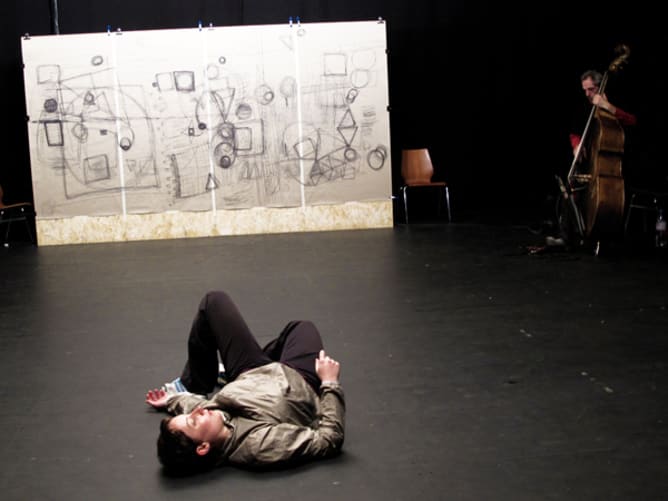 Double prélude à 4 mains réunit Janyce Michellod (danse), Frédéric Debraine (musique), Bruno Michellod (arts plastiques), Raphaël Vincent (lumière) et Hans Van Meerten (son).