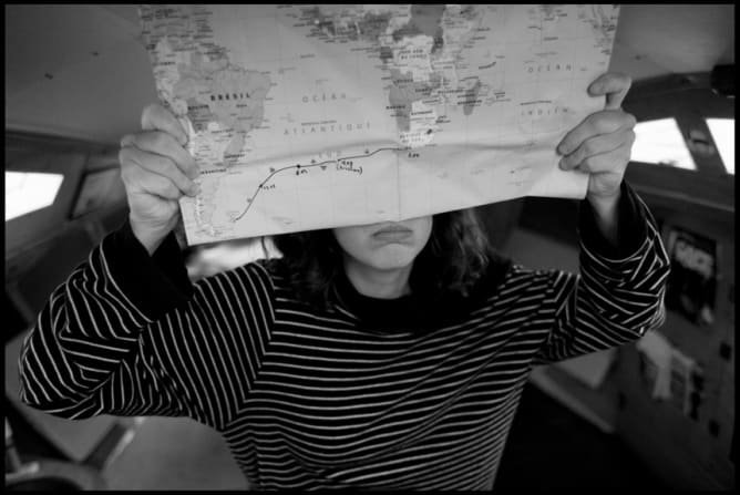 During several years of wandering along Africa, Brazil and Argentina, the crew and their boat, named Dira, refined and adapted themselves to motorless sailing. This clean navigation, which was supposed to be temporary until an engine could be afforded, had become over the years a way of life, a navigation technique, in ports and rivers, in anchorages, in storms.