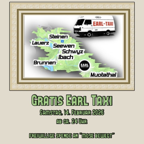 Dieses Wochenende, den 14. Februar 2026, mache ich noch eine PR-Aktion. Ich biete gratis das Earl Taxi an und bringe die Gäste nach dem Konzert und / oder der Afterparty nach Hause.Die Leute können freiwillig eine Spende an mein Crowdfunding geben. Starten tue ich um ca. 24 Uhr.