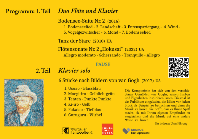 Das Werk für Klavier solo «6 Stücke nach Bildern von van Gogh» ist auch besonders. Die Komponistin hat sich von den verschiedenen Gemälden van Goghs, seinen Farben und Eigenheiten inspirieren lassen. Diesmal ist das Publikum eingeladen, die Bilder vor jedem Stück als Beispiel zu betrachten und dann die Musik zu hören. Drei Werke sind Uraufführungen.