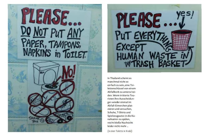 Egal, ob skurrile Verkehrsschilder, hanebüchene Poster, infantile Wandbeschriftungen, lachhafte Plakate, sinnloses Geschreibsel von Privatpersonen, irreführende Wegweiser, absurde Vorschriften, kunstvolle Hai-Warnungen, Nonsens-Hinweise, hirnrissige Regeln auf Toiletten, klamaukige Hotelnamen, Anti-Reklamen, Selfmade-Verbote, ulkige »Vorsicht vor«-Tafeln, Fake-Anweisungen, hieroglyphisches Kauderwelsch, lustige Lebensmitteletiketten, in die Hosen gegangene Crowdfunding-Aktionen, amüsante Verpackungen oder groteske Menükartentexte, – nichts war vor meiner Kameralinse sicher. Aufgepeppt mit gelegentlichen Hintergrundinformationen über Land und Gegebenheit des abgebildeten Schildes und mit vielen lustigen Kommentaren versehen ist das Buch alles, nur nicht langweilig!
