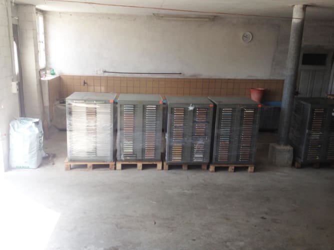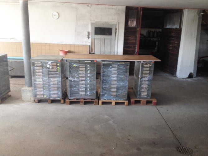 Ein erster Teil unseres Projekts ist erfolgreich realisiert. Zusammen mit unserem Aktivmitglied André Wunderle konnten wir 20 Paletten mit Original-Bleischriftenkästen für den Umzug bereit stellen.
