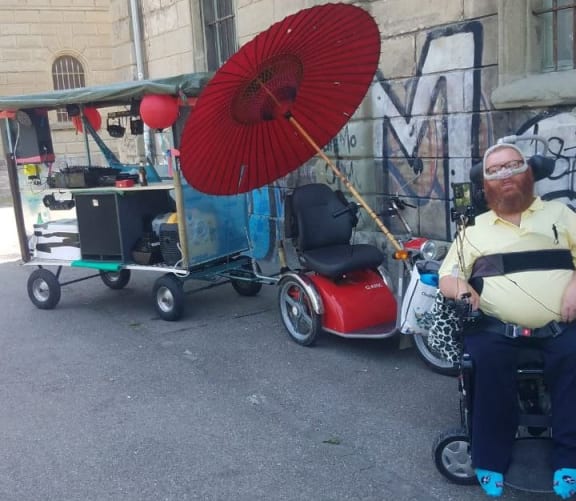 Die Teilnahme an der Streetparade von Mirco und Freunden stand fest, doch Mirco wollte auch etwas beitragen: Also erstand er einen alten Postwagen, den er an seinem elektrischen Rollstuhl anhängen konnte und liess sein privates Soundsystem mit Generator darauf aufbauen.