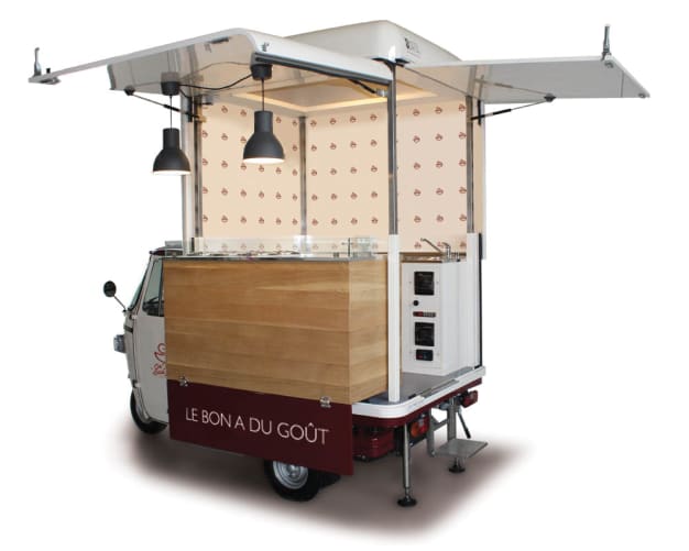 Le triporteur peut paraître petit mais il n’en est rien! Amovible en hauteur et en largeur, très fonctionnelle, la cellule sera équipée de deux frigos de 150 litres chacun, de deux plans de préparation, d’un fry top, de deux feux de 30 cm, d’une crêpière, d’un extracteur de jus et d’un lavabo et pourra accueillir deux personnes.