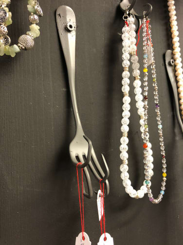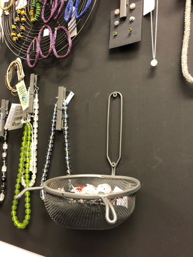 So toll, dass wir ein superkreatives Teammitglied haben. Sie hat diese coole upcycling Schmuckwand gemacht. Gegen den anthrazitfarbenen Hintergrund kommt unser Fair Trade Schmuck richtig schön zur Geltung.