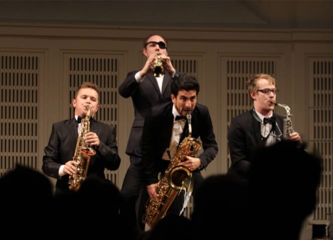 Our show is an unusual combination of music, choreography, acting and lighting. We bring together all those elements to create an unforgettable concert experience. Every moment of the 90-minute show is choreographed and performed by memory, which makes for an engaging, whirlwind audience experience. The performance is packed with surprises intended for both novice and experienced listeners, and the show is appropriate for audiences of all ages.
