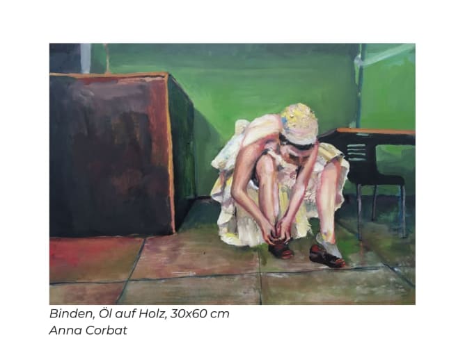 Anna Corbat ist 2004 geboren und die jüngste der beteiligten Künstlerinnen. Sie lebt in Bern, absolvierte den Vorkurs und besucht zurzeit die Grafik-Fachklasse in Biel. Sie spielt Theater, strickt viel und gern und die «heure bleu» ist ihre liebste Tageszeit. Am liebsten aber malt sie und gedanklich ist sie ständig auf der Suche nach Sujets und Bildern, die auf die Leinwand wollen.
