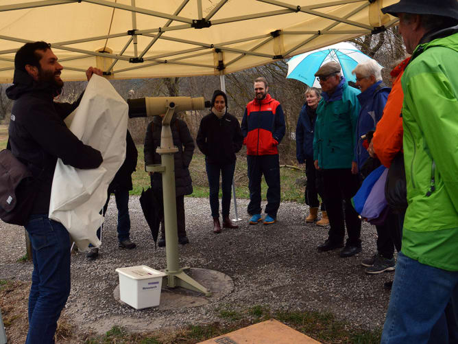 Eine Woche vor Saisonstart wurde das neue, gigantische Fernrohr in der Naturstation eingeweiht. Eingeladen zur Führung durch die Naturstation mit extra langem Halt beim neuen Fernrohr waren 20 Unterstützer der Crowdfunding-Kampagne.