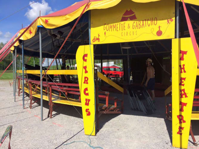 Notre chapiteau a été fabriqué en Italie en 2005. Nous l’avons racheté à l’école de cirque de Lacanau en 2011 en sachant que l’air océanique avait pas mal abîmé la toile. Bref, un chapiteau tout percé, c’est pas pratique, c’est pas joli, mais surtout c’est fragile et dangereux.