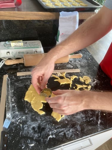 «Guetzlen? Mit einer professionellen Konditorin? Das hört sich doch super an! Und wenn wir damit einen Traum in Schweden (mit)unterstützen können: Umso besser – als Skandinavienfans können wir es nachvollziehen, dass man da hochziehen möchte. So haben wir also einen Guetzliworkshop mit Cornelia «gebucht». Wir waren gespannt, was uns erwartet. Wir konnten unsere Guetzliwünsche angeben und der Einkaufszettel liess schon viel Schoggi & Süsses erahnen :) Am Morgen kam Cornelia in unsere Küche ins ZüriOberland und wir wurden von ihr immer gut angeleitet, was wir wann machen sollen. Einige Sachen hat sie zum Glück selbst in die Hand genommen! Dank Cornelias Planung hatten wir (und bald auch der Backofen) immer was zu tun, aber wir waren nicht überfordert. Dass sie dann zwischendrin noch eine Schwarzwäldertorte zusammengestellt hat, war für sie glaubs total normal (wir fragen uns heute noch, wie man so viele Sachen gleichzeitig machen kann). Schon sehr bald sah man das Resultat unseres Workshops! Und am Nachmittag waren wir dann fertig: Zimtelche & -octopusse, Schokokugeln, Planta-Chätzli, Spitzbuebe und Mandelflorentiner stapelten sich auf unserem Wohnzimmertisch. Als Cornelia sich in ihr wohlverdientes Wochenende verabschiedete, machten wir grad noch einen weiteren Stapel Schokokugeln – wir wussten schon, dass die reissenden Absatz haben werden. Am Sonntagmorgen haben wir dann alles noch fertig gebacken & Guetzlikisten, respektive Säckli verpackt. So konnten wir einige verschenken und sind uns heute noch einig: Es sind wirklich alles wunderbare feine Guetzli! Helt fantastisk! Tusen Takk!»