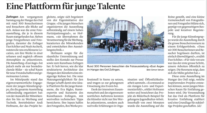 HANGAR ist ein soziokultureller Ort, der mit viel Partizipation entsteht. Menschen können hier eigene Projekte umsetzen, mitgestalten und sich aktiv einbringen. Schon jetzt haben Jugendliche zwei Fotoausstellungen selbst organisiert – begleitet vom OXIL und dem Kunsthaus Zofingen. Ebenso wurden zahlreiche Videoprojekte und eine Rollschuh-Disco durchgeführt.