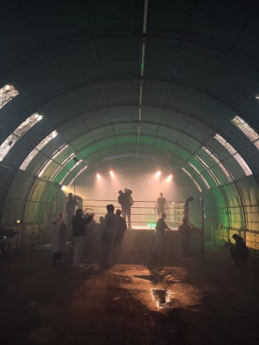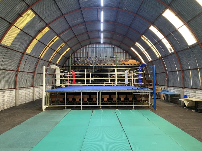 Im HANGAR gibt es rund 333 m² asphaltierte Fläche – überdacht, wettergeschützt und gut belüftet. In der Mitte steht ein Boxring, der auch als Bühne für Theater, Konzerte oder Performances genutzt werden kann.