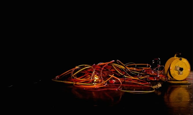 Eine Bühne überhäuft mit Kabeln – roten, gelben, schwarzen und orangefarbenen. Ein bunter, sirrender Kabelsalat. Ein dichtes Netz, dem man nicht so einfach entrinnt. Fünf PerformerInnen schlängeln sich durch das Wirrwarr, bahnen sich ihren Weg, orientieren sich an Geräuschen und Beats, kreuzen Wege und Kabel, verbinden sich. Die Live-Musik ist Teil des Ganzen, bricht überraschend aus, gibt neue Impulse, polarisiert und verbindet. Wo endet das Chaos und wo beginnt Vernetzung?