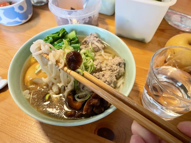 Zmittag zu Hause.Da es heute kalt ist, habe ich statt Schweinebraten eine besondere Variante Sesam-Rindfleischbällchen mit starkem Ingwergeschmack zubereitet, serviert in einer Brühe auf Miso-Shiitake Basis mit selbsthandgemachten Ramen Nudeln.Beim Kochen geht es darum, die Grundlagen zu beherrschen und dann frei improvisieren zu können.