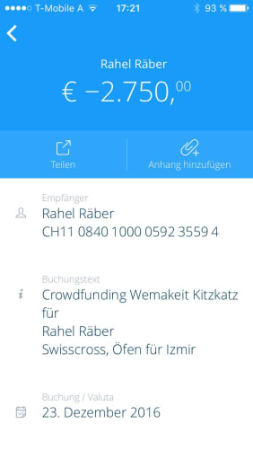 Die Crowdfunding-Plattform hat mir am 23.12.2016 nach Abzug der Transaktions-Gebühren 2585 EUR überwiesen. Weil ich entschieden hatte, sämtliche Vesandkosten für die Belohnungen doch selbst zu tragen, und weil ein paar Personen mir außerhalb des Crowdfundings Geld für die Aktion gegeben hatten, konnte ich am selben Tag insgesamt 2750 EUR an Swisscross überweisen.