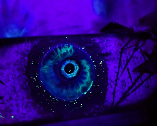 Ce projet est unique car c’est un événement qui se passera en forêt de jour mais aussi de nuit, une exposition qui se passera dans le noir où les visiteurs seront munis d’un bâton de lumière noire afin de se balader et voir mon art fluorescent . Exceptionnellement toute personne pourra être présente et observer de jours et de nuit la première partie du stage avec les futurs initiés durant la danse chamanique autour du feu et l’art de la peinture intuitive.