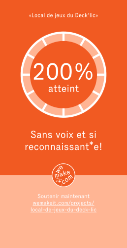 C’est fou!!! On y est, on a atteint 100%! On est tellement reconnaissants que vous nous ayez fait confiance et on a trop hâte de vous montrer ce qu’on prépare grâce à tout ça. Maintenant, il reste encore 15 jours avant la fin, et on vous propose de continuer l’aventure ! Avec des fonds en plus, on pourra ajouter encore plus de déco, de petites surprises diverses et variées et surtout, acheter des jeux pour offrir une encore plus grande diversité de matériel ludique dans le local! Alors parlez-en encore autour de vous, envoyez le lien à toutes les personnes qui pourraient être intéressées par le projet, et notez déjà bien la date suivante : 17 et 18 janvier. C’est durant ces deux jours qu’aura lieu l’inauguration du local ouverte au public!!