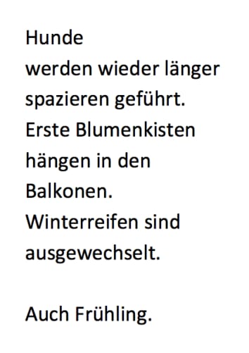 Ein Gedichtband: knapp 100 Seiten mit etwa 80 Gedichten und einem Dutzend «Gegen-Sätze» zu Natur und Stimmungen, zu Liebe und Sinnlichkeit, Trauer und Trost, zu Politik und Gesellschaft. Eine Prise Heiterkeit, ein Körnchen Romantik, ein Schuss Nachdenklichkeit und einen Bissen Gesellschaftsskepsis. Verständliche, hintersinnige, überraschende, kurze, wohl dosierte Gedichte.