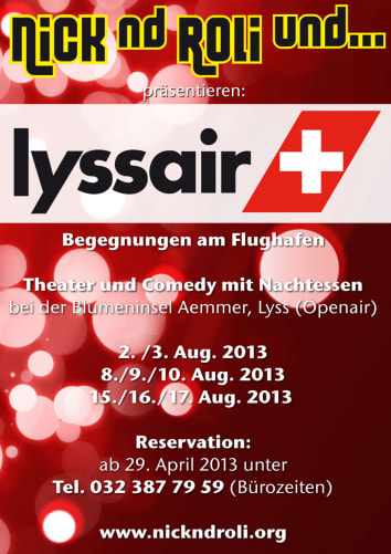 Lyssair ist ein Theater mit Szenen auf einem Flughafen. Menschen kommen und gehen, Menschen, die sich kennen oder auch nicht. Das wird komisch, traurig, schräg oder emotional, aber immer unterhaltsam. Die 4 Schauspieler schlüpfen dabei immer wieder in andere Rollen und werden während einer Aufführung über 20 verschiedene Figuren darstellen, die sich auf dem Flughafen der Lyssair begegnen.