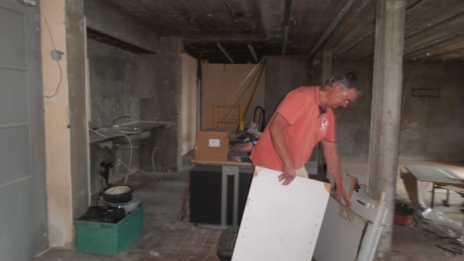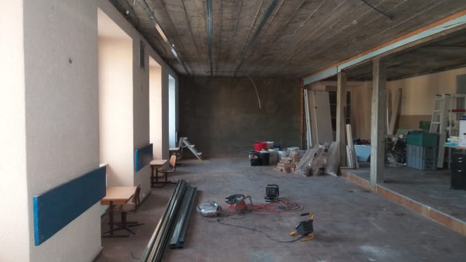 Casser une ancienne aération; balayer ses «dégâts» ;-); poser les crochets métalliques au plafond de la future cuisine; faire des trous pour pouvoir passer des fils électriques et en même temps, communiquer par le gros trou du plafond de la cuisine aboutissant à la salle de classe du haut (sûrement utilisé pour ce gros câble alimentant un ancien frigo, étant donné que notre future salle de classe sera dans un ancien «tea room»: café-restaurant du village ! La salle polyvalente, quand à elle, était, jadis, une ancienne boulangerie, d’où le pain y était acheminé à destination du café-restaurant du dessus et un certain atelier, au dire des villageois âgés…)