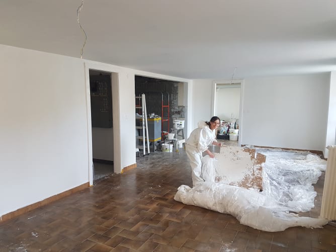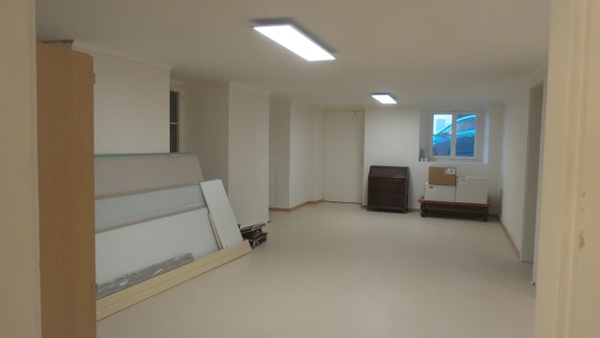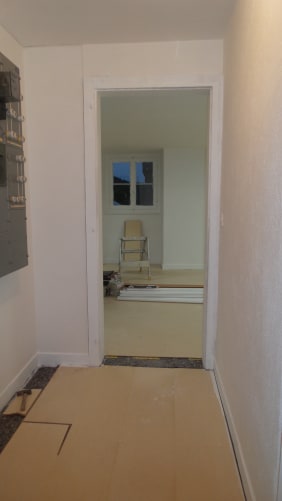 Petits avancements qui font une belle différence ! Samuel a enfin réussi à passer la frontière France-Suisse le dimanche 17 mai, grâce à la touchante et précieuse aide de la directrice de l’EMS (maison de retraite) à côté de chez nous, dans lequel il travaille durant ses vacances depuis maintenant plusieurs années. Elle a transpiré afin de faire les démarches nécessaires de son côté, en tant qu’employeur, pour mettre à jour les papiers pour le canton de Vaud, déclarant Samuel au sein de son établissement pour un travail impératif dans les soins auprès des personnes âgées. Samuel a dû donc passer deux semaines de confinement dans le futur secrétariat de l’école et a été le premier à inaugurer la nouvelle cuisine de la salle polyvalente :-)! Il a donc posé des plinthes en bois au sou-sol contre celles en céramiques; le travail a été compliqué, car percer dans cette vieille céramique la faisait éclater à tout moment ou la fissurait très facilement… Il faut donc la recoller avec du mastique et repeindre les pièces visibles.
