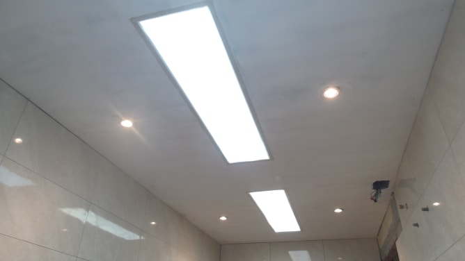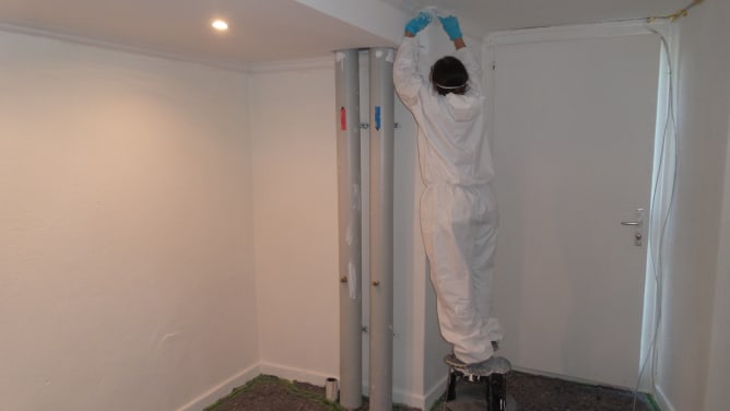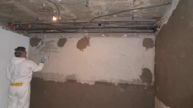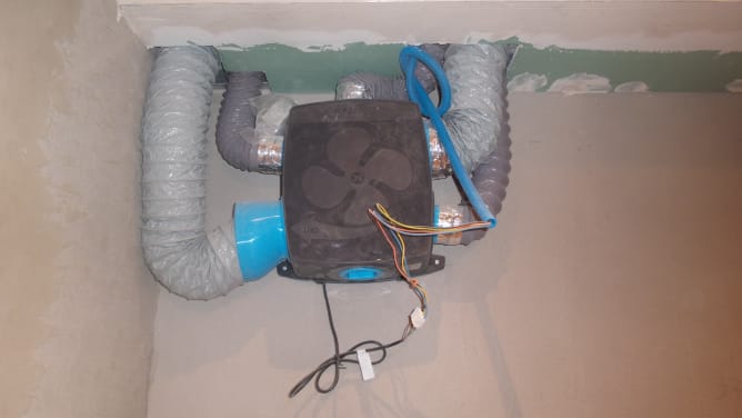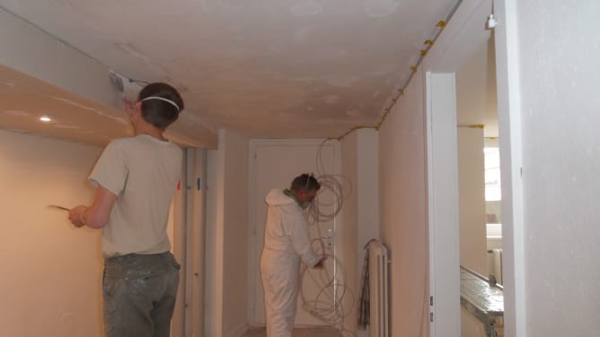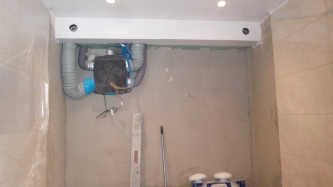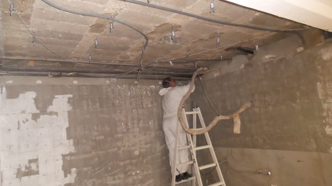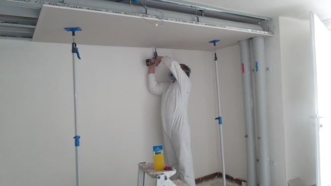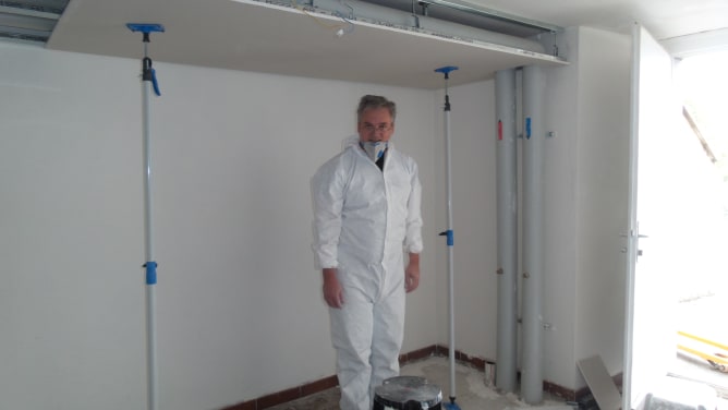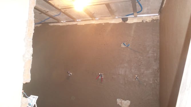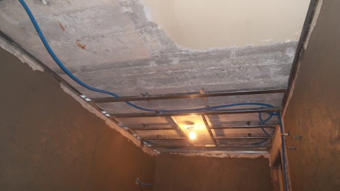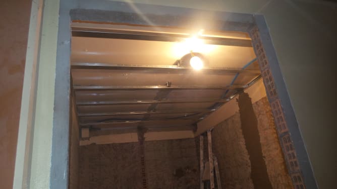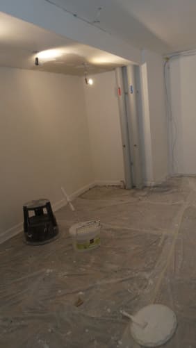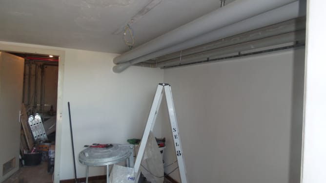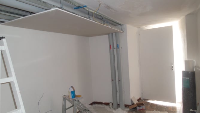 En supplément à cela, ils purent aussi accrocher quelques crochets pour accueillir des barres métalliques au plafond de cette même salle, afin de pouvoir y fixer du placoplatre, pour ensuite enfin le terminer, plus tard, par deux couches de peinture dépolluante !