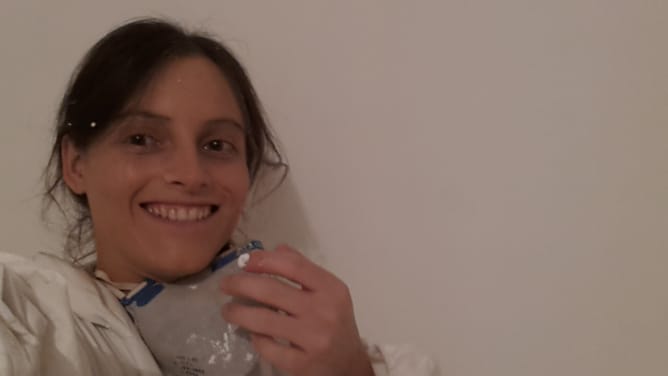 Des fourmillements parurent à ma main droite et un malaise m’envahit…Mais quel soulagement d’être libérée de cette emprisonnement ! Étant claustrophobe, à chaque fois que cela m’arrive, une angoisse me prend, mais j’essaie de la gérer, me répétant à moi-même que ce cauchemar prendra certainement fin bientôt… Avoir l’impression d’être enfermé dans son propre corps est vraiment paniquant ! Je savais en plus que cela n’allait pas s’arrêter là : des semaines d’immobilisation s’imposaient et je devais à nouveau faire face au travail à une main, à l’écriture à une main, aux douches à une main, aux habillements et déshabillements à une main, aux repas à une main… et bien sûr, nuit et jour immobilisée, à devoir à nouveau supporter ces douleurs de post-luxation…