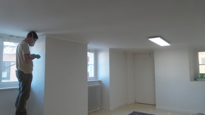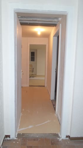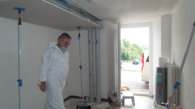 Samuel fixa, sur la bordure du petit plafond du vestiaire, un filet que papa avait acheté, à Hornbach bien sûr ;-), afin que l’on ne voit pas les coupes de placoplatre en y passant la peinture. Il dû donc refaire des couches de lissage par-dessus, afin que ce filet ne se voit plus !