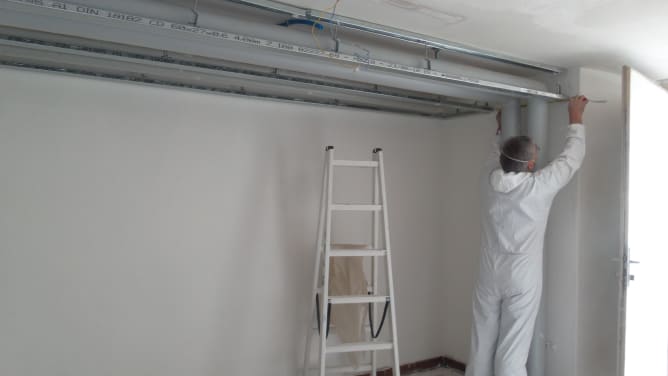 Suspendre des crochets et des barres métalliques afin d’y visser des plaques de placoplatre au plafond du futur vestiaire; peindre, peindre & re-peindre : portes, linteaux et tout ce qui n’est pas blanc ou presque on dira, dont mes cheveux et tout le reste… ;-D!