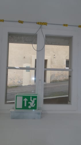 Mon papa a tiré les fils électriques + fil internet + pour les caméras de sécurité, au-travers des trous que nous avions percé vendredi et ma tâche, consistait à scotcher ces câbles tout autour du plafond de la pièce, de faire des boucles aux fenêtres & aux portes, afin de laisser ensuite l’équipe de la société de sécurité faire son travail une fois que nous les aurons appelé (pose des différentes alarmes et caméras…); pendant ce temps, Samuel continuait à lisser, lisser & relisser les plafonds du vestiaire et mit enfin la dernière couche, en devant laisser sécher le tout à chaque fois, avant de repasser dessus…