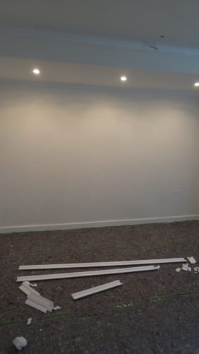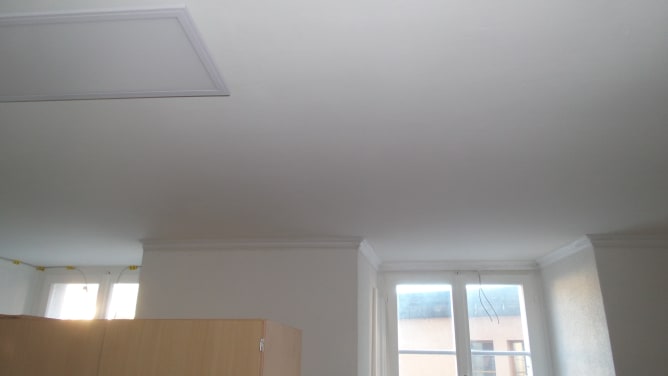 C’était ensuite enfin au tour des moulures blanches de se faire coller au plafond, afin de cacher ces horribles scotches jaune pétant, ainsi que ces câbles électriques !
